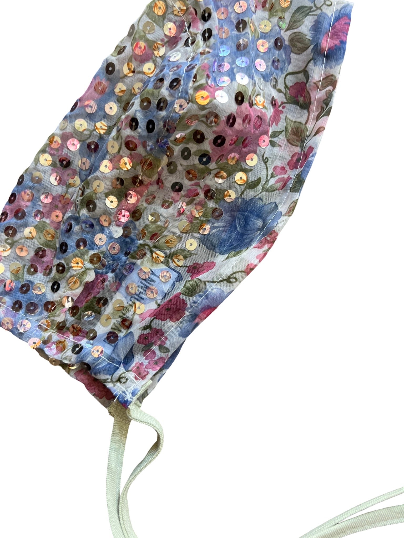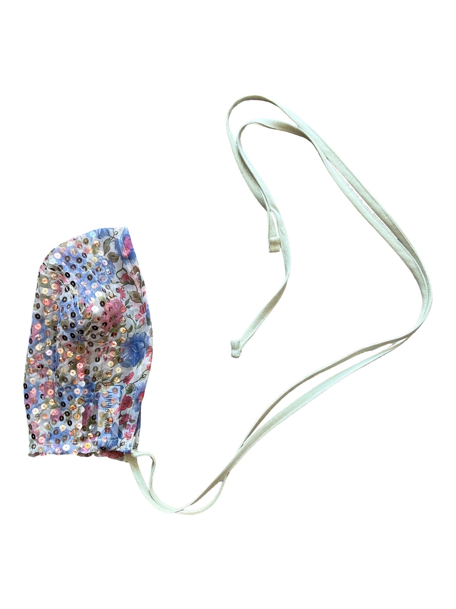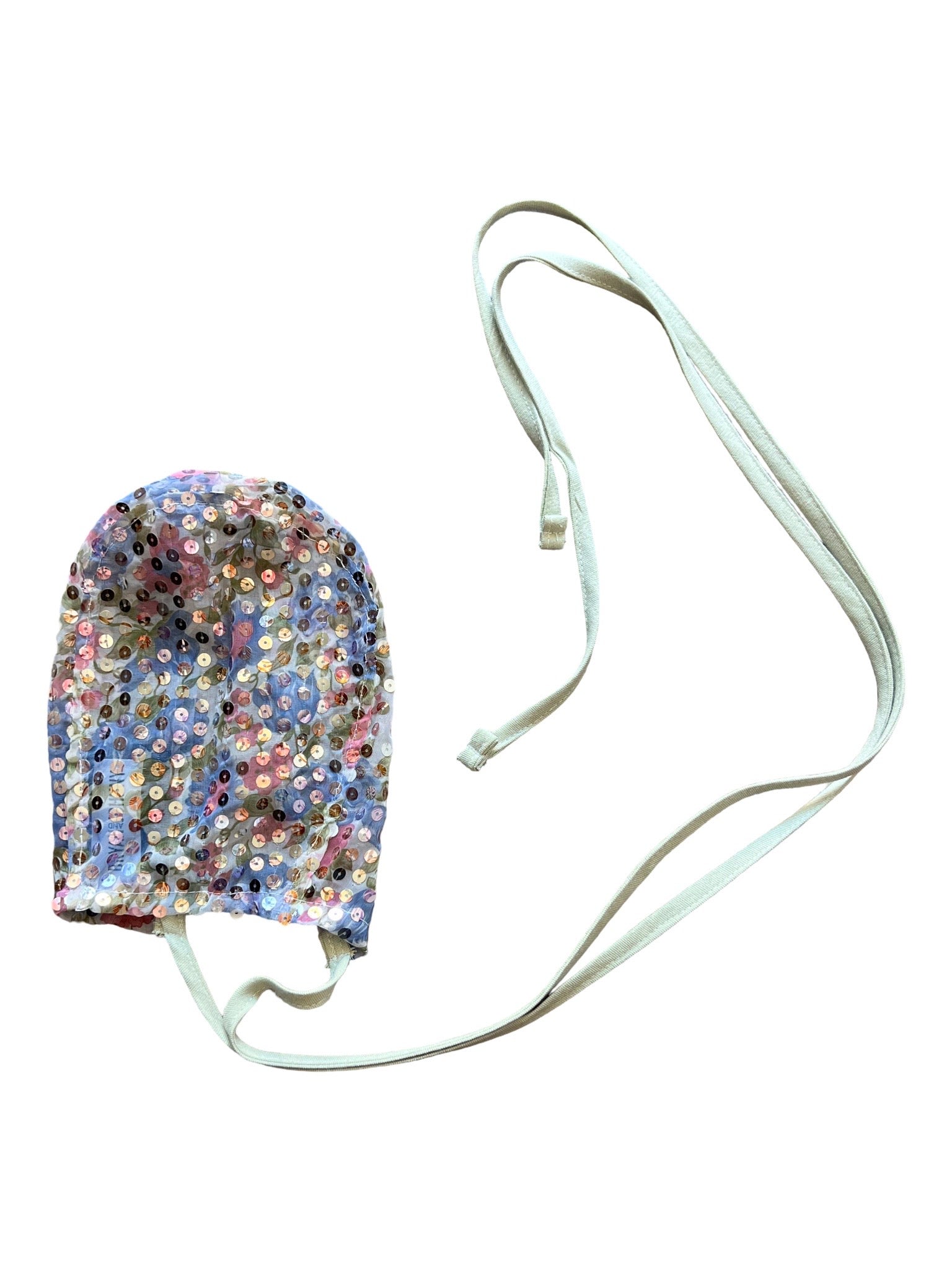 Meet the LONCHERA fitted cap in a multi color sequin fabric, sheer with adjustable tie OSFM